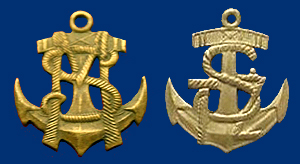 ("Admirał Nelson", "Trafalgar", "po co szerokie spodnie", "skąd wziął się kołnierz" itd.) Zajmę się tym, co wyróżniało naszą szkołę i nasze mundury od mundurów innych szkół marynarskich. Zacznę od emblematu głównego czyli "kotwiczki" noszonej na czapkach i naramiennikach. Jest dziś trudno ustalić kto i kiedy opracował wzór emblematu szkolnego TŻŚ, ale z cała pewnością wzorował się na emblemacie Szkoły Morskiej, co widać na rycinie obok. W obu niemal ta sama, stylizowana kotwica admiralicji opleciona jest linami tworzącymi inicjały nazwy szkoły. Obydwa emblematy były zbliżone rozmiarami i wykonane z tego samego stopu metalu, z którego produkowane były guziki do marynarskich mundurów.
