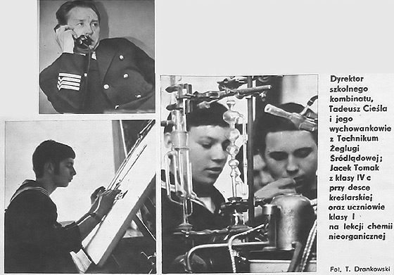 Przed jednym z gmachów stoi niby pomnik nadbudówka starego bocznokołowca rzecznego (oczywiście to błąd - przyp. red.) a na nim flagowy maszt. Zaczepiam pierwszego napotkanego chłopaka, w mundurze nie różniącym się w zasadzie od uniformów szkól morskich. Idziemy do dyrekcji. Mój uprzejmy przewodnik, barczysty, rumiany, musiał być niezgorszym osiłkiem wśród rówieśników w rodzinnej wiosce. Dyrektor Tadeusz Cieśla uśmiecha się słysząc tę moją uwagę: